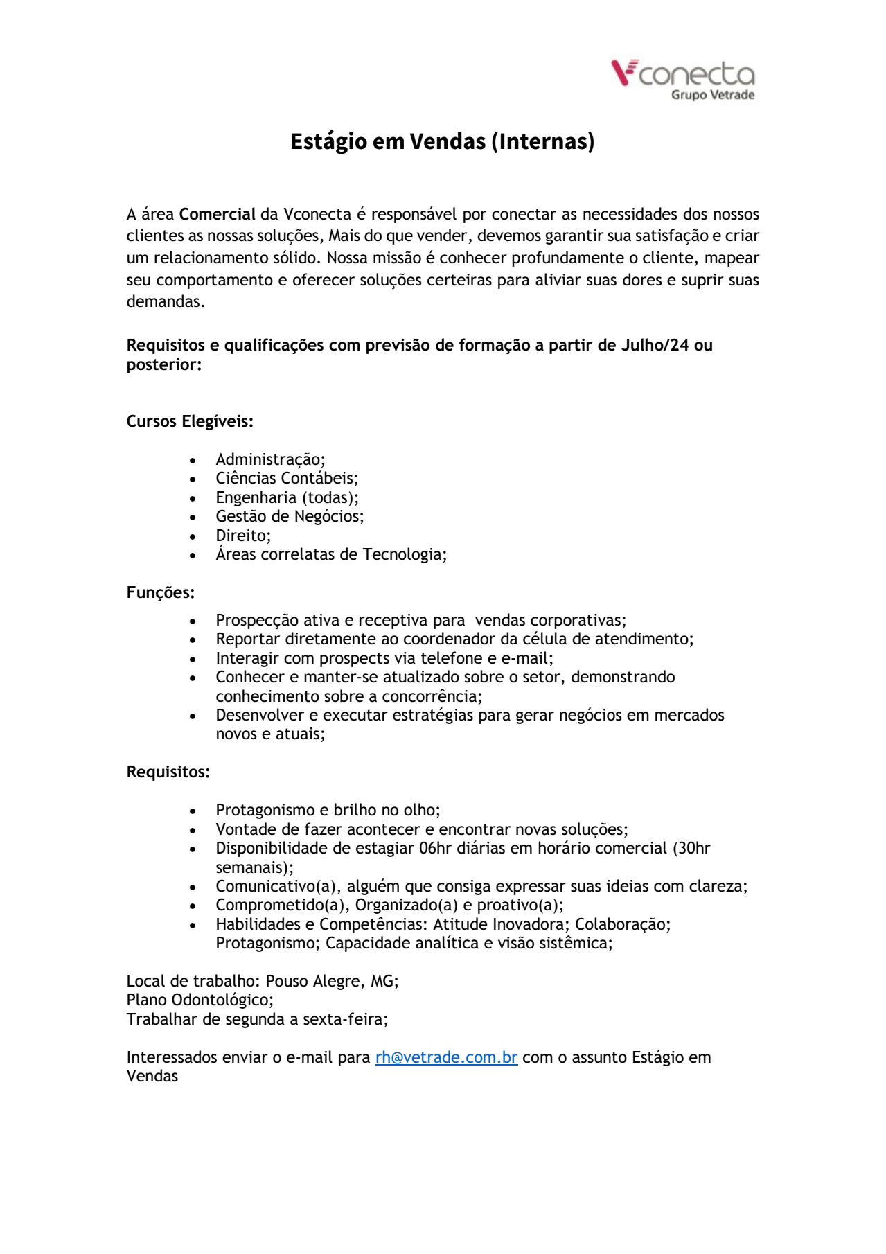 ESTÁGIO EM VENDAS (INTERNAS) – GRUPO VETRADE – POUSO ALEGRE