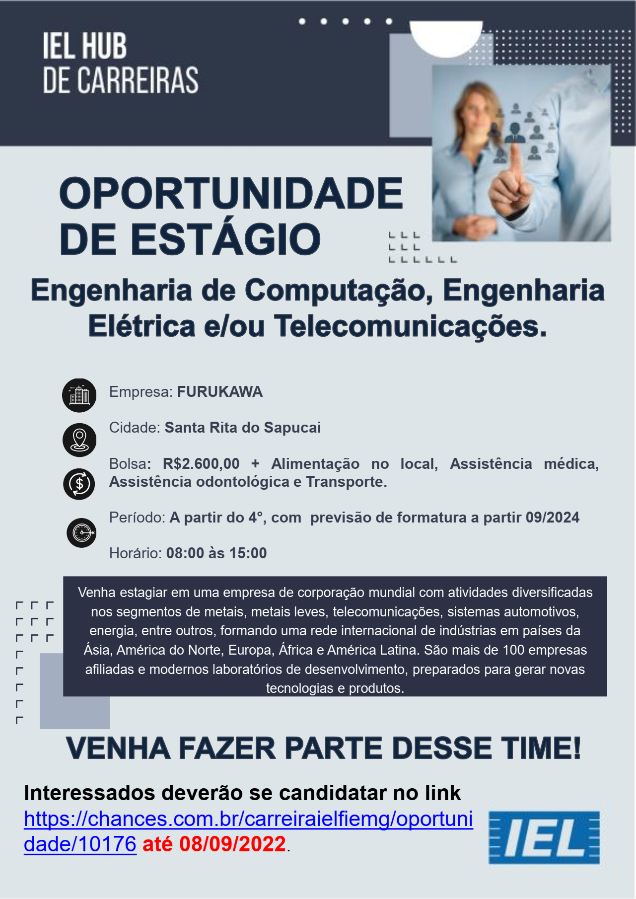 Interessados deverão se candidatar no link https://chances.com.br/carreiraielfiemg/oportunidade/10176 até 08/09/2022.