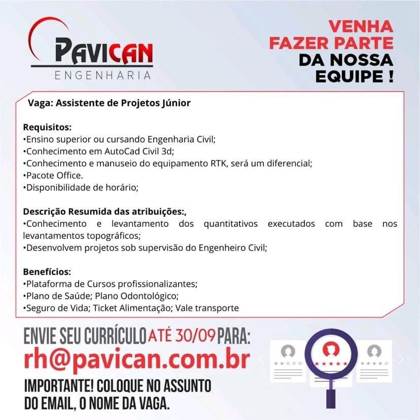 OPORTUNIDADE DE EMPREGO – ASSISTENTE DE PROJETOS JÚNIOR – PAVICAN ENGENHARIA