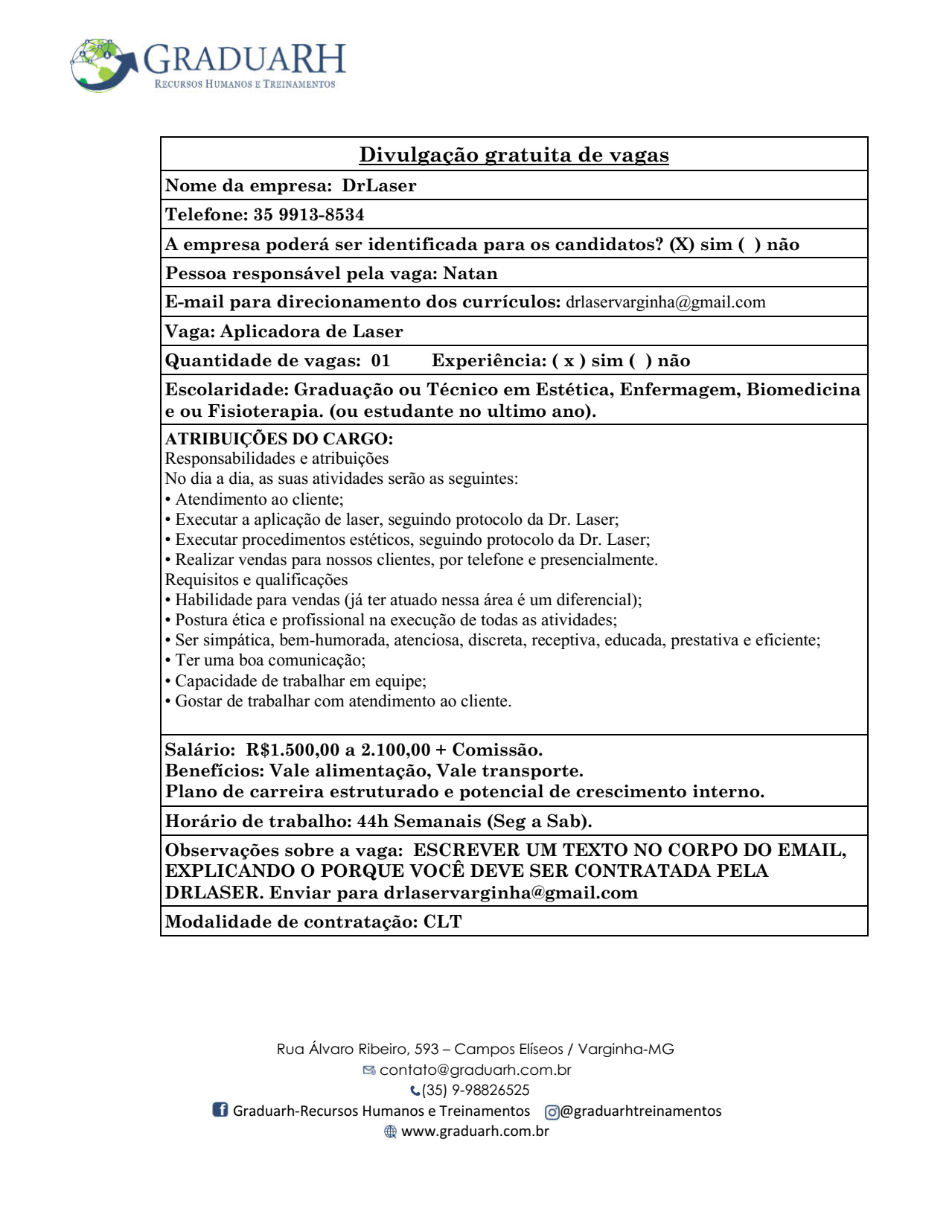 OPORTUNIDADE DE EMPREGO – ENFERMAGEM / BIOMEDICINA / FISIOTERAPIA – GRADUARH